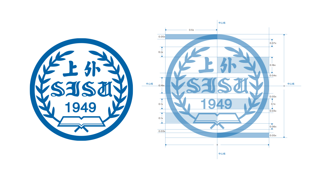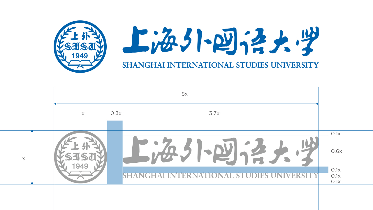 為適應(yīng)不同使用場合和載體環(huán)境,特規(guī)定了上外?;张c標(biāo)準(zhǔn)字的多種常用組合方案,以確保學(xué)校視覺形象傳達(dá)的清晰、完整和統(tǒng)一。上外 VI 系統(tǒng)對校標(biāo)組合的布局結(jié)構(gòu)進(jìn)行了科學(xué)定義,其標(biāo)準(zhǔn)制圖以 x 為基本計量單位,用以標(biāo)注各設(shè)計要素的空間比例關(guān)系。