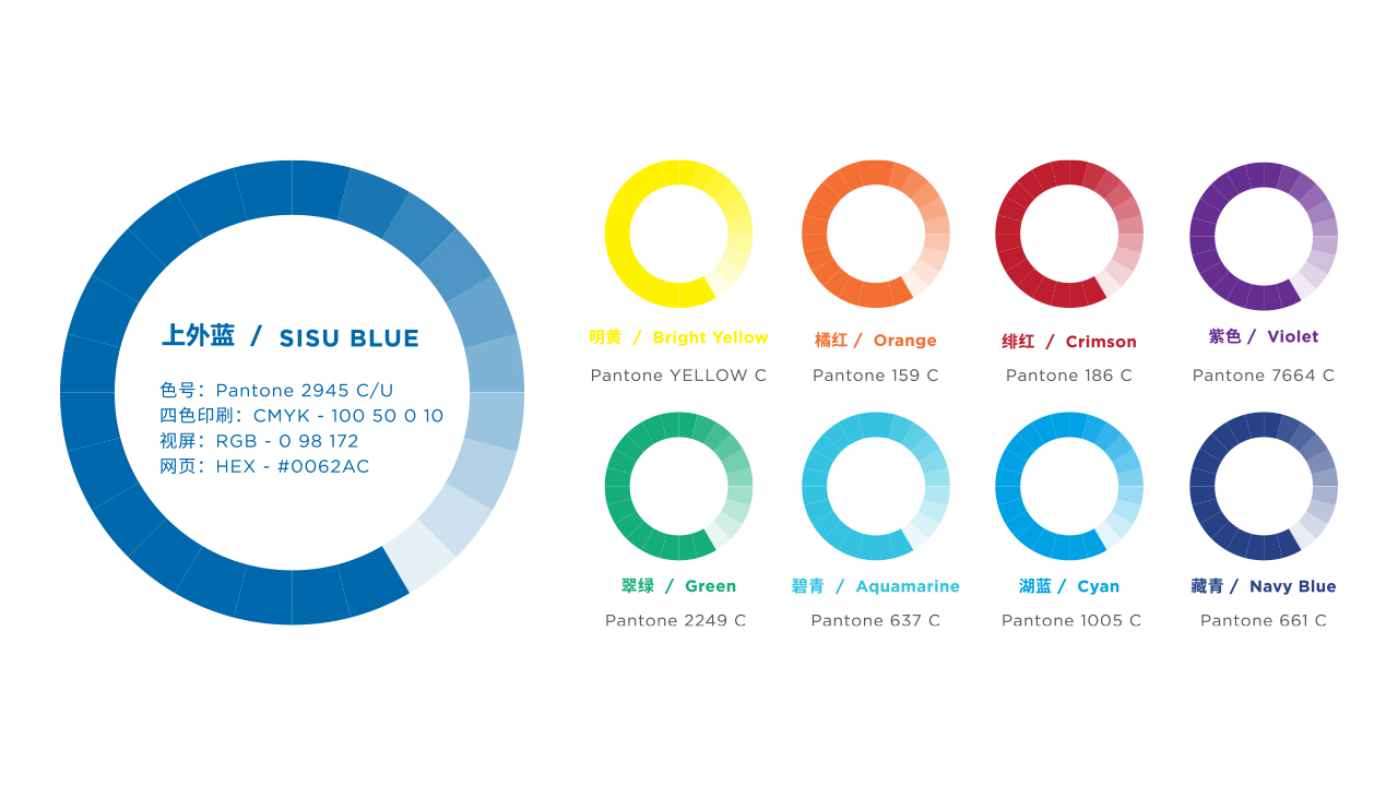 為豐富和強(qiáng)化視覺效果,使學(xué)校的視覺形象統(tǒng)一而富有變化,體現(xiàn)多元文化交融的國際化辦學(xué)特色,上外 VI 系統(tǒng)中規(guī)定明黃、橘紅、緋紅、紫色、翠綠、碧青、湖藍(lán)、藏青為輔助色。